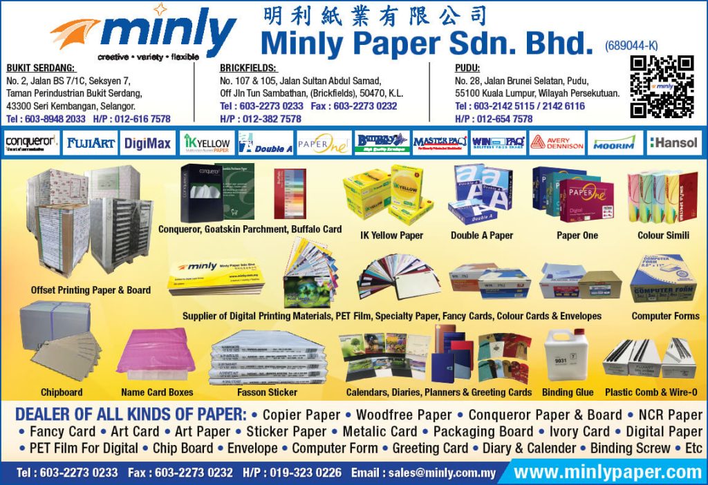 Minly Paper Sdn. Bhd. was established primarily in the retail, supply and distribution of a broad range of paper and envelope products. Founded since 1996, and widely known for its enormous ranges and brands of high quality paper products. Minly Paper has progressively gained its reputation within the industry, satisfying daily paper needs for both enterprises and individuals including the printers, stationers, small offices and large corporations. Minly Paper located conveniently at the heart of business hub of Brickfields, Kuala Lumpur and expanded with two more business outlet at Pudu, Kuala Lumpur & Bukit Serdang, Selangor.