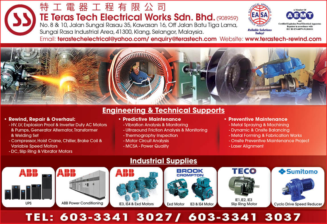 TE Teras Tech provides a complete one-stop maintenance solution for the overhaul, repair, reclamation and rewinding for all types of electric motors, mechanical components and parts. The company is also able to customize and advise you with the best mechanical and electrical solutions. Other specialty services of TE Teras Tech include periodic and preventive maintenance services, predictive maintenance services as well as lubrication solutions and industrial product distribution.